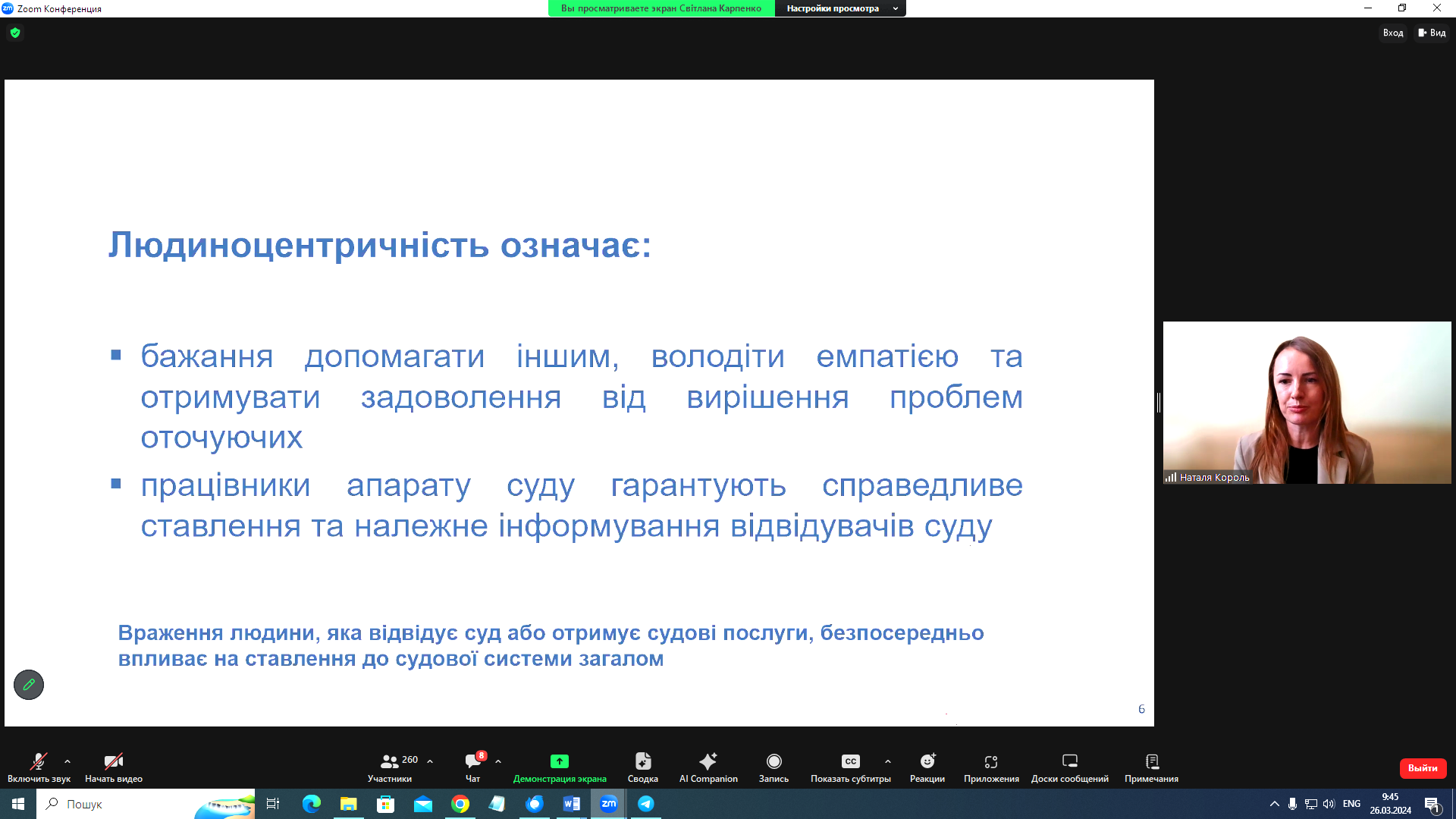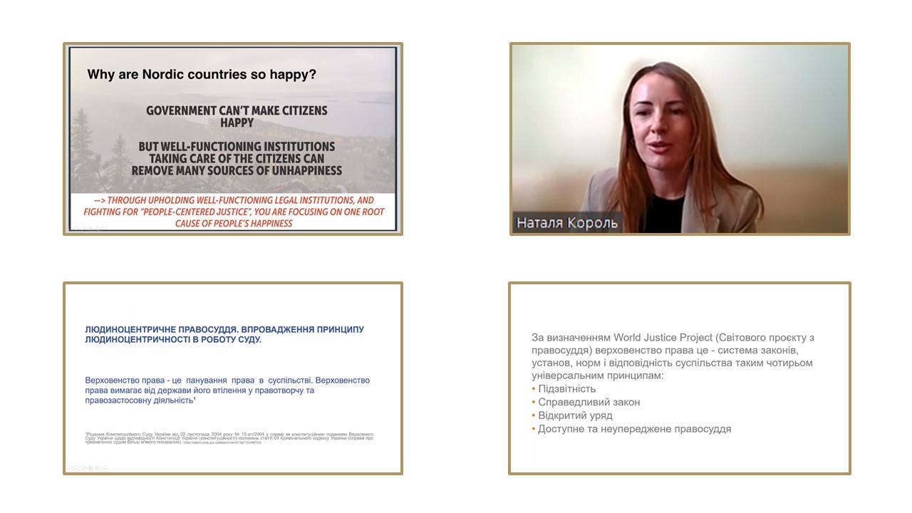 Людиноцентричність – це бажання допомагати іншим, володіти емпатією й отримувати задоволення від вирішення проблем інших людей. Такий принцип також означає, що працівники апарату суду гарантують справедливе ставлення та належне інформування відвідувачів суду. Ці тези стали лейтмотивом лекції «Людиноцентричне правосуддя. Впровадження принципу людиноцентричності в роботу суду. Поради та досвід українських судів», яку на сьогоднішньому онлайн-семінарі "Доступ до правосуддя вразливих груп населення: запровадження сервісів та особливості комунікації" провели керівниця апарату Вінницького апеляційного суду Наталя Король та її заступниця Світлана Карпенко. Завдяки тренінгу, організованому Харківським регіональним відділенням Національної школи суддів України, свою кваліфікацію підвищували працівники апарату місцевих та апеляційних судів України.