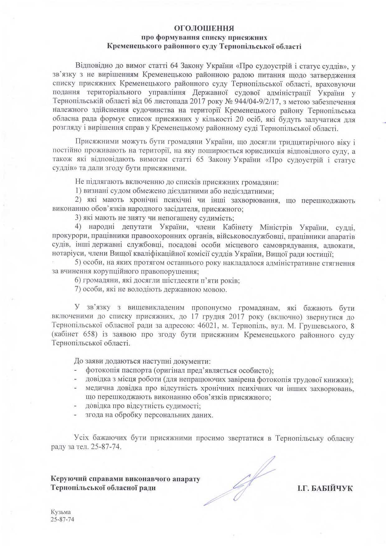 Тернопільська обласна рада оприлюднила оголошення про формування списку присяжних Збаразького районного суду, оголошення про формування списку присяжних Кременецького районного суду та оголошення про формування списку присяжних Теребовлянського районного суду.