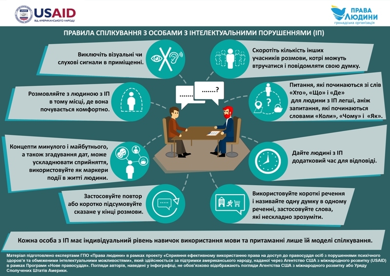Експерти ГПО «Права людини» в рамках проекту «Сприяння ефективному використанню права на доступ до правосуддя осіб з порушеннями психічного здоров’я та обмеженими інтелектуальними можливостями», який здійснюється за підтримки американського народу, наданої через Агентство США з міжнародного розвитку (USAID) в рамках програми «Нове правосуддя», розробили правила, які необхідно використовувати при спілкуванні з особами з інтелектуальними порушеннями.
