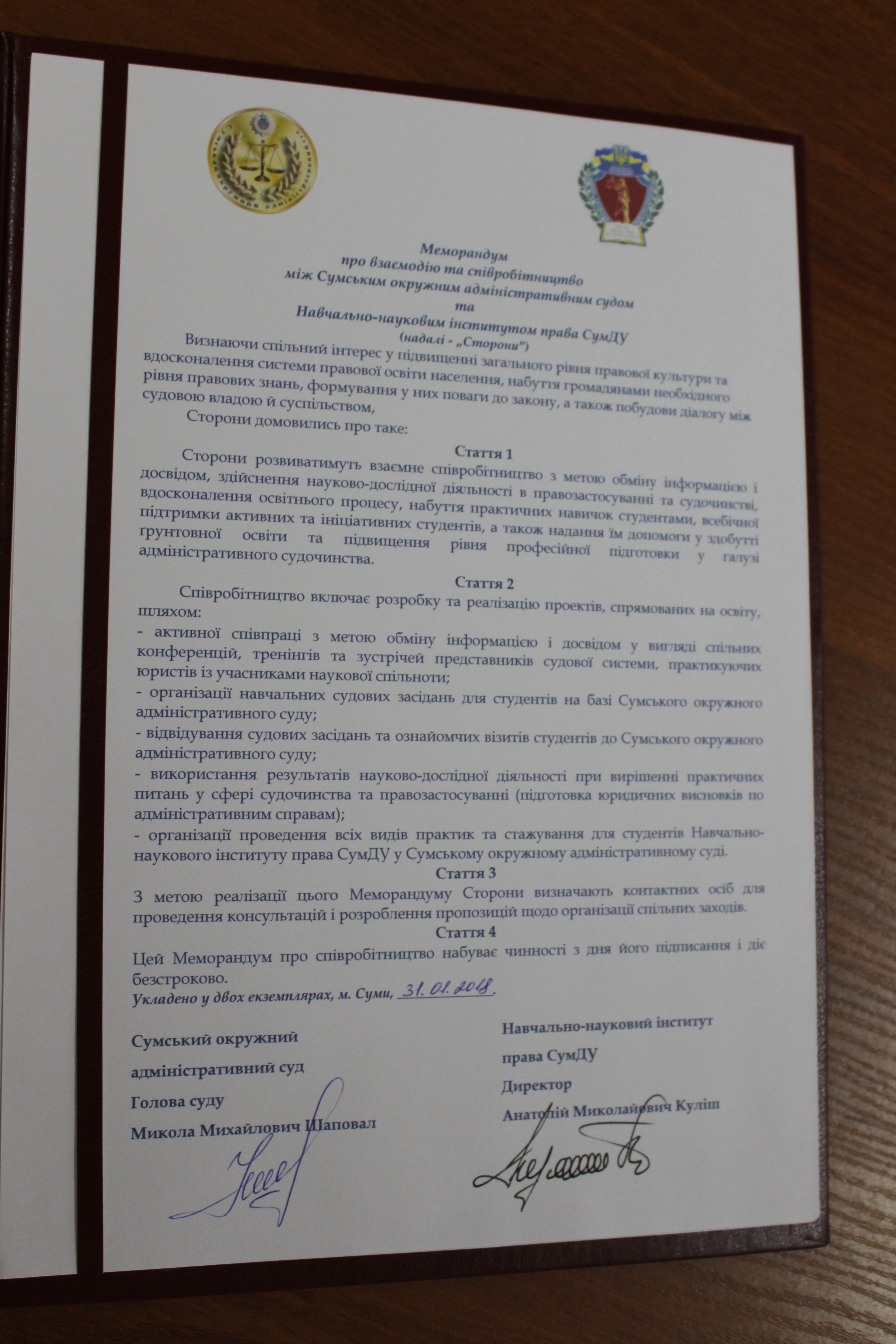 Сьогодні, 31 січня 2018 року, голова Сумського окружного адміністративного суду Микола Михайлович Шаповал та директор Навчально-наукового інституту права СумДУ Анатолій Миколайович Куліш підписали Меморандум про взаємодію та співробітництво між Сумським окружним адміністративним судом та Навчально-науковим інститутом права СумДУ.