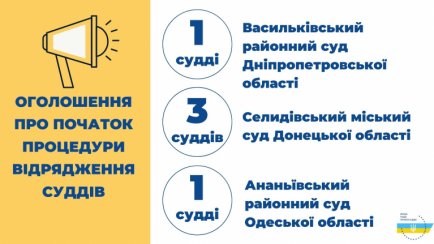 Наразі у Васильківському районному суді Дніпропетровської області та Ананьївському районному суді Одеської області припинено доступ до правосуддя, зокрема через закінчення строку повноважень суддів, які перебувають на посадах у вказаних судах.