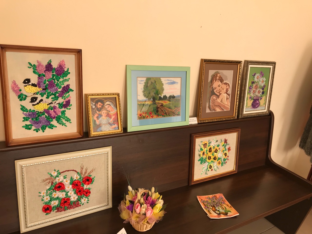 В експозиції представлені вишиті картини, вишиті ікони, в’язані вироби, вироби з бісеру, вишиванки, рушники та серветки. Поряд з картинами також представлені авторські ляльки.
